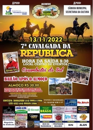 Corumbataí do Sul - Acontece neste domingo a 7ª Cavalgada da República. A saída será às 9h30, no Centro de Eventos. Mais informações com Borginho (44) 9 9914-1906 ou com Luis Gali 9 9889-5966.