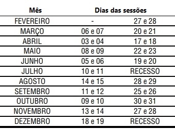 Saiu o calendário das sessões ordinárias deste ano da Câmara de Campo Mourão. Serão 38 ano longo do ano. As primeiras acontecem dias 27 e 28 de fevereiro (neste segunda tem reunião extraordinária). As últimas foram marcadas para 18 e 19 de dezembro. Na segunda quinzena de julho tem o tradicional recessinho de meio de ano. As sessões são quinzenais, sempre às segundas e terças-feiras, às 9h.