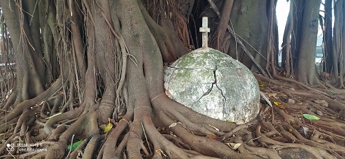 No Cemitério Municipal de Campo Mourão, a figueira está "engolindo" o antigo ossário.