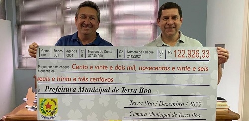 Em Terra Boa, o ex-presidente Wanderlei Esposto levou o "checão" de R$ 122,9 mil para o prefeito Edmilson Moura.