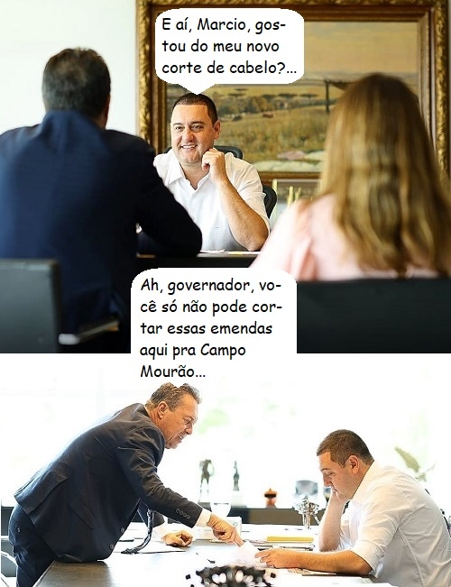 Os cliques são desta segunda-feira, no Palácio Iguaçu, em Curitiba, onde o deputado Marcio Nunes se reuniu com o governador Ratinho Jr. Sim, é ele, de visual novo. A vice-prefeita Fátima Nunes também participou. Do que falaram? "Tratando de assuntos ligados ao desenvolvimento de nosso estado e de Campo Mourão", postou Marcio.