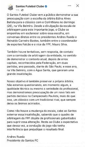 "Como não houve a mudança da escala, cabe ao Santos externar essa insatisfação", destaca postagem do clube.