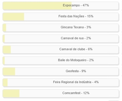 "Além da Festa do Carneiro no Buraco, o que mais deveria voltar a ser realizado em Campo Mourão?" Enquete encerrada neste domingo deu vitória à alternativa "Expocampo", com 47% dos votos. A "Festa das Nações" ficou em segundo, com 15%, e a "Comcam Fest" em terceiro, com 12%. O resultado completo está no quadro acima.