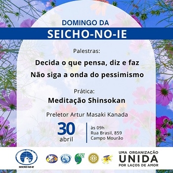 Campo Mourão - "Decida o que pensa, diz e faz" e "Não siga a onda do pessimismo" são as palestras que serão proferidas neste domingo (9h) na Seicho-no-ie. O preletor será Artur Masaki Kanada.
