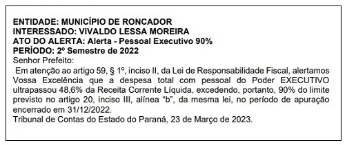 O Tribunal de Contas do Estado publicou nesta segunda-feira alerta para a prefeitura roncadorense. Motivo? Encerrou o segundo semestre de 2022 comprometendo acima de 48,6% da receita corrente líquida com a folha de pagamento. Não atingiu o limite de 54% previsto na Lei de Responsabilidade Fiscal, mas já requer cuidados da administração municipál, daí a razão do alerta.