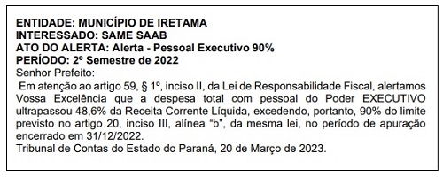 Segundo publicação feita nesta quinta-feira pelo Tribunal de Contas, endereçada ao prefeito Same Saab, a prefeitura encerrou segundo semestre de 2022 comprometendo acim de 48,6% da receita corrente líquida com a folha de pagamento. Não estou os 54% do limite da Lei de Responsabilidade Fiscal, mas já requer atenção, daí o motivo do alerta.