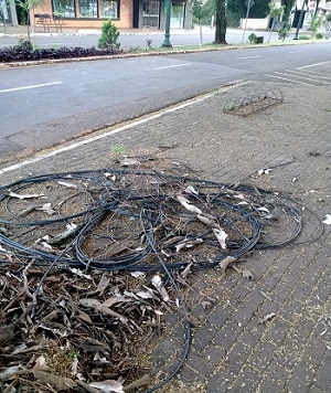 Na av. Manoel Mendes de Camargo, esquina com a Santa Catarina, a fiozeira está há vários dias jogada na calçada.