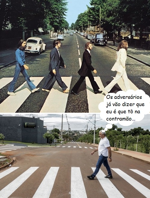 O clic de baixo é do vereador Miltinho do Cidade Nova, de Campo Mourão, que foi nesta terça-feira acompanhar a pintura da sinalização na Vila Urupês e no jardim Cidade Alta 2. Qualquer semelhança com a pose dos Beatles na clássica capa do álbum Abbey Road (1969), na foto de cima, é mera coincidência...