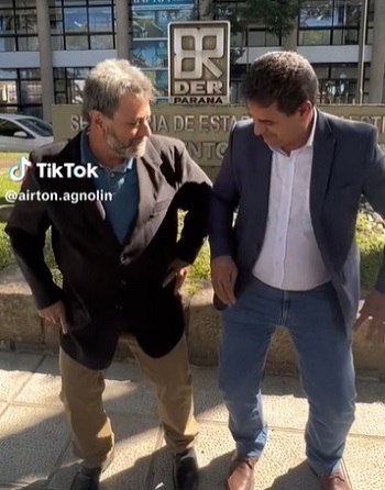 Não foi só depoimento que os prefeitos Airton Agnolin (Nova Cantu) e Vivaldo Lessa (Roncador) fizeram em frente ao DER, em Curitiba, após conseguiram autorização para construção de ponte entre os dois municípios, não. Também teve dancinha. Tudo postado no perfil de Agnolin no Tik Tok e ao som de "Desenrola, bate e joga de ladinho". "Viva nós com a ponte!", destacou o prefeito cantuense. "Viva Roncador e Nova Cantu!", emendou Lessa.