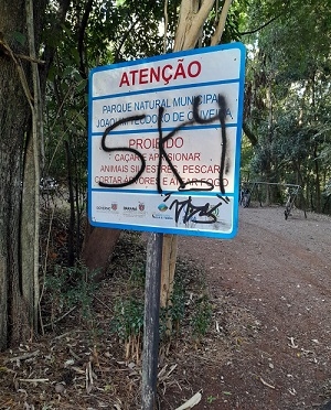 Placa pichada no Parque do Lago, em Campo Mourão.