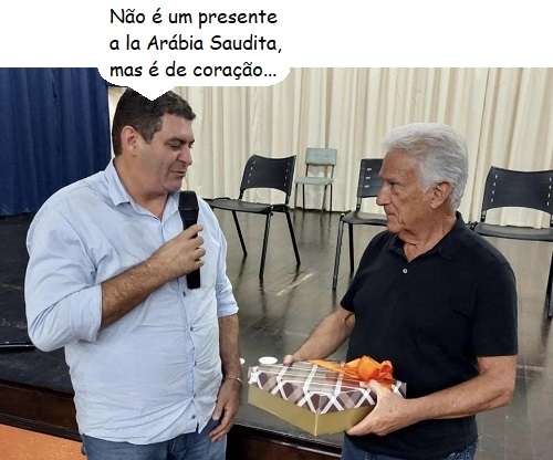 O ex-deputado federal Rubens Bueno passou esta semana por seis cidades da região para prestar contas do mandato encerrado em janeiro. Em pelo menos três - Barbosa Ferraz, Peabiru e Ubiratã - ganhou brindes em agradecimento. Em Barbosa Ferraz, o prefeito Edenilson Miliossi fez a entrega. E que fique claro: nada de jóia valiosa, não...