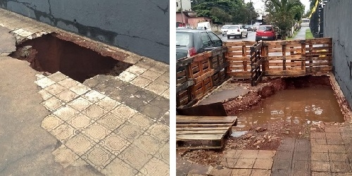 Na rua São Paulo, centro de Campo Mourão, o buraco na calçada começou assim (à esq.) e agora está assim (à dir.).