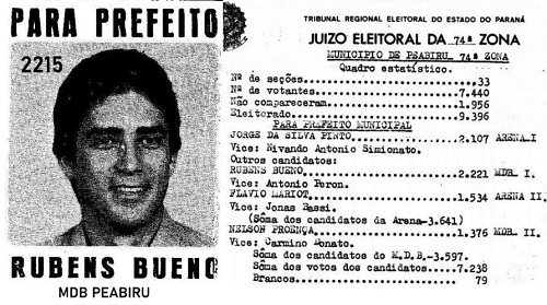 Detalhe 1: Rubens Bueno seria eleito deputado estadual em 1982, federal em 1990 e prefeito de Campo Mourão em 1992. De lá pra cá, tem vários mandatos na Câmara Federal. Também foi candidato a prefeito de Curitiba e a governador.