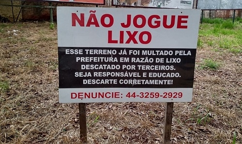 Placa colocada em terreno na av. Jorge Walter, em Campo Mourão. O texto apela para que não seja jogado lixo no local. Cita até que o imóvel já foi multado por lixo deixado por terceiros. "Seja responsável e educado", destaca a placa.