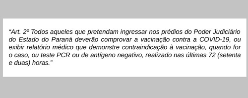 Um decreto do TJ/PR obriga a comprovação da vacina contra covid-19 para ingressar nos prédios do Poder Judiciário.