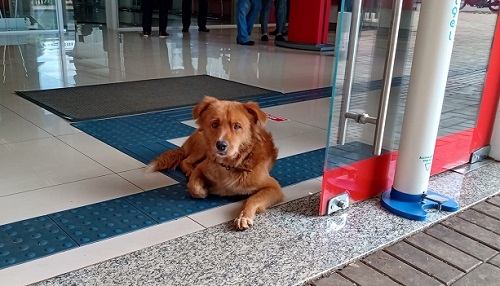 Cachorro cuida da porta de entrada da agência do Bradesco de Campo Mourão.