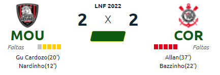 Campo Mourão e Corinthians empataram em 2 a 2, neste sábado, no Belin Carolo, pela Liga Nacional de Futsal.