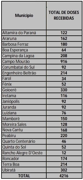 A 11.a Regional de Saúde vai distribuir 10.591 doses de vacina nesta quarta-feira pela manhã. Tem Astrazeneca, Coronavac e Pfizer. Do total, 4.216 são para a primeira dose, sendo 916 para Campo Mourão (veja os demais municípios da Comcam no quadro acima).