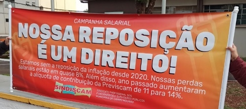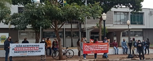 Um grupo de servidores municipais participou no final da tarde desta quinta-feira de mobilização em frente à prefeitura de Campo Mourão. O prinicpal objeito é cobrar o reajuste salarial que não é dado desde o ano passado. Este ano a prefeitura ofereceu 2%, o que foi recusado pela categoria. A mobilização também levou faixas com críticas ao projeto de terceirização que a administração enviou para a Câmara.