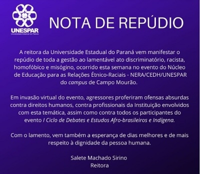 A reitoria da Unespar divulgou "nota de repúdio" para fato que ocorreu durante evento online do Núcleo de Educação para Relações Étnico-Raciais, do câmpus de Campo Mourão. Foi uma "invasão virtual" com ofensas a direitos humanos e profissionais da instituição. A nota fala em "lamentável ato discriminatório, racista, homofóbico e misógino".