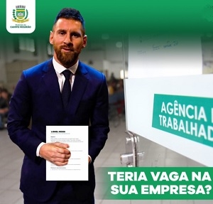 Até a prefeitura de Campo Mourão resolveu brincar com o anúncio da saída de Messi do Barcelona. Como ainda não definiu novo clube, o craque argentino está "tecnicamente desempregado". Por isso, a prefeitura postou montagem nas redes sociais com Messi levando currículo na Agência do Trabalhador.