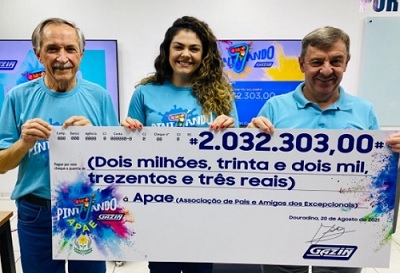 Olha aí o presidente da Federação Nacional das Apaes, José Turozi, de Campo Mourão, recebendo o checão de mais de R$ 2 milhões do grupo Gazin. O valor foi arrecadado em julho durante a campanha "Pintando o 7". Compras acima de R$ 100 tiveram R$ 7 convertidos para a Apae. O valor será distribuído para mais de mais de 200 Apaes em 10 estados onde a rede possui lojas físicas.