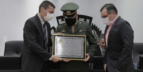 O sargento do Exército Lisandro de Freitas Alves recebeu nesta segunda-feira o títulot de Mérito Militar da Câmara de Campo Mourão. Foi durante sessão solene com a presença de seis vereadores. A entrega foi feita pelo vereador Bina Teixeira, autor da proposição, e pelo coordenador geral da prefeitura, Carlos Alberto Facco. Lisandro foi chefe de instrução do Tiro de Guerra.