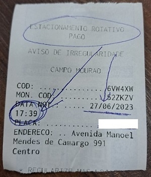 "Notificação da Zona Azul de Campo Mourão às 17h39. Pagar por 30 minutos e usufruindo de apenas 21. Absurdo".