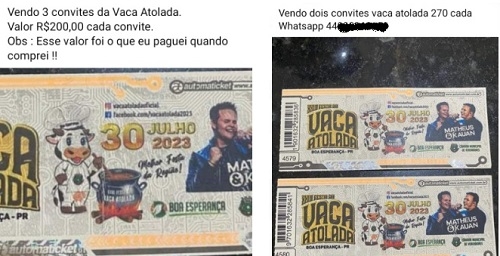 O convite para a Festa da Vaca Atolada, que acontece no próximo domingo, em Boa Esperança, foi vendido pela prefeitura a R$ 125. Além do almoço, dá o direito ao show com a dupla Matheus & Kauan. Só que os convites se esgotaram rapidamente. Resultado: tem gente revendendo o ingresso pelas redes sociais. Só que o preço aumentou. E bastante. Há pedidos de R$ 200 e até de R$ 270 pela unidade.