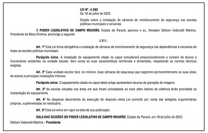 A Câmara de Campo Mourão promulgou a lei que obriga a prefeitura a instalar câmeras de segurança em escolas municipais.