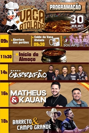Acontece neste domingo a 23ª Festa da Vaca Atolada, em Boa Esperança. Além do prato típico, que será servido a partir das 11h30, a programação inclui três shows. Começa a banda Garrafão (14h), depois vêm Matheus & Kauan (16h) e, pra fechar, tem Barreto & Campo Grande (18h).