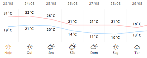Vai fazer muito calor nesta quarta e quinta-feira em Campo Mourão. O Simepar está prevendo temperaturas máximas acima dos 30 graus nestes dois dias. Na sexta chove e cai um pouquinho. Já no sábado cai mais e por três dias a máxima não passa dos 21 graus, com mínima de 10. O "friozinho" segue até terça, quando a máxima fica em 18 graus e só então começa a esquentar outra vez.