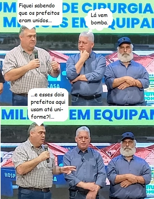 Os cliques são desta quinta-feira, em Campo Mourão, onde o secretário de Estado da Saúde, Beto Preto, assinou convênio de R$ 5 milhões com a Santa Casa local. O dinheiro é para a compra de equipamentos. Os prefeitos Douglas Fabrício (Campo Mourão) e Same Saab (Iretama) foram ao evento com camisas iguais...