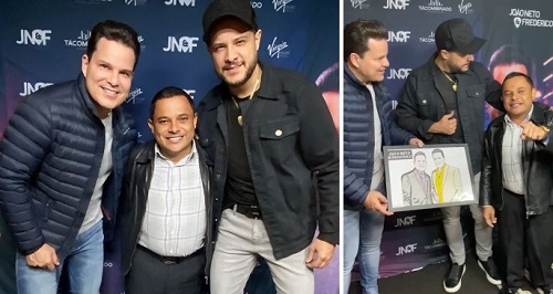A dupla João Neto & Frederico, que estará na Festa do Carneiro no Buraco, em Campo Mourão, encerrou neste domingo a Expobira, em Ubiratã. E olha quem esteve lá, o “recepcionista oficial” de Campo Mourão, Magnum Alves. Presentou a dupla com um de seus desenhos e tudo.