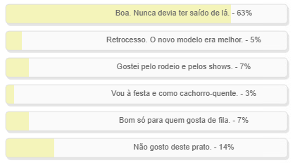 “O que você acha da volta da Festa do Carneiro no Buraco do Parque de Exposições”. Enquete encerrada neste domingo deu vitória, com folga, à alternativa “Boa. Nunca devia ter saído de lá”. Teve 63% dos votos. “Não gosto deste prato” ficou em segundo, com 14%. “Gostei pelo rodeio e pelos shows” e “Bom só para quem gosta de fila” empataram em terceiro, com 7%. O resultado completo está no quadro acima.