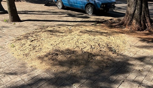 Monte de areia no calçadão (esquina da rua Brasil). Faz dois anos que está no local.