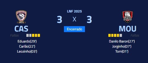 Campo Mourão empatou em 3 a 3 com o Cascavel, fora de casa, nesta sexta-feira, pela Liga Nacional de Futsal.