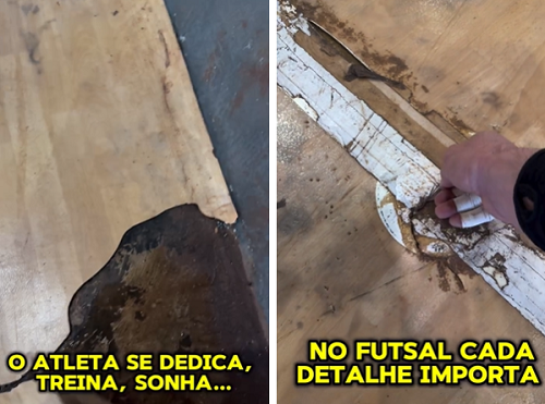 Djony, goleiro do Pato Futsal, em vídeo postado em redes sociais em que critica o estado da quadra do ginásio Belim Carolo, de Campo Mourão; neste domingo. Em tempo: O Pato não conseguiu vencer os mourãoenses e foi eliminado na oitavas na Liga Nacional de Futsal.