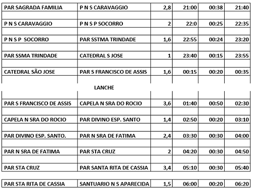 O quadro acima mostra a distância entre cada paróquia e o tempo que se levará entre uma e outra.