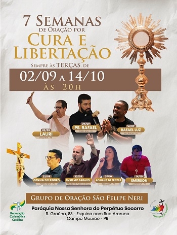 Começa nesta terça-feira, na paróquia Nossa Senhora do Perpétuo Socorro, em Campo Mourão, o evento “Sete semanas de oração por cura e libertação”. Será sempre às terças-feiras, às 20h, até o dia 14 de outubro.