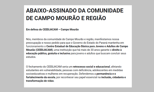 Um abaixo-assinado está sendo realizado em Campo Mourão em defesa da manutenção do Ceebjacam.