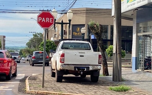Tava escrito “Pare” na placa e a camionete parou… em cima da calçada. Rua Araruna esquina com av. Manoel Mendes, centro de Campo Mourão.