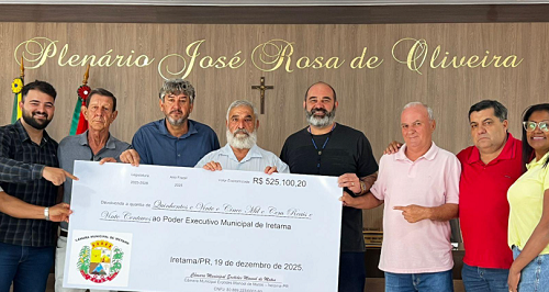 A Câmara de Iretama devolveu para a prefeitura R$ 525,1 mil de sobras do exercício. O checão simbólico foi entregue segunda-feira pelo presidente Digão e outros vereadores ao prefeito Same Saab. Segundo Digão, as sobras são fruto do compromisso do legislativo com a responsabilidade fiscal, a transparência e a boa gestão dos recursos.