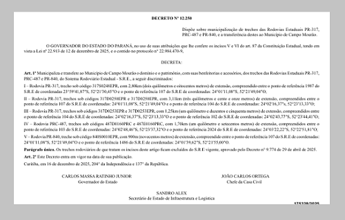 O governo do Estado publicou decreto que municipaliza trechos das rodovias PR-317, PRC-487 e PR-840, em Campo Mourão.