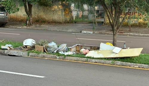 No canteiro da Av. Goioerê, próximo à rua Miguel Luiz Pereira, há descarte irregular de lixo. Entre os materiais jogados no local, encontra-se até um vaso sanitário. Fica o alerta: canteiro não é lugar para lixo. É preciso respeito com a cidade e com o espaço público.