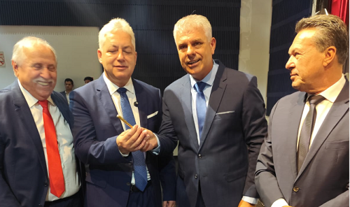 Tauillo Tezelli, ex-prefeito, e Fátima Nunes, vice-prefeita reeleita de Campo Mourão, ao encerrarem seus discursos na posse do prefeito Douglas Fabrício, nesta quarta-feira. A frase era “marca registrada” do ex-prefeito Nelson Tureck, que também acompanhou a posse, assim como outro ex-prefeito, José Pochapski.