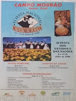 ...para o prato típico de Campo Mourão ser servido na 25ª Festa Nacional do Carneiro no Buraco. O cartaz ao lado é da sexta edição do evento, realizada em 1996. O carneiro foi servido dia 14 de julho, mas as atrações no Parque de Exposições começaram antes, dia 6, com a Festa dos Estados e Nações, que foi até dia 13.