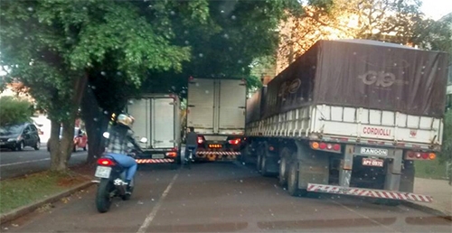 “O que é isso? Cena de uma movimentada rodovia? Não! É a av. José Custódio de Oliveira, entre as ruas São Paulo e Mato Grosso, na manhã desta segunda-feira. Ainda era hora de carga e descarga, mas a carreta e o caminhão baú desse tamanho não deveriam estar no centro da cidade”.