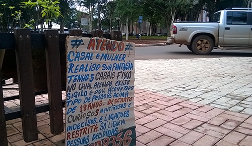 Olha só a “placa publicitária” que apareceu nesta segunda-feira numa floreira do calçadão, na esquina da av. Capitão Índio Bandeira com a rua Brasil. O anunciante diz que atende “casal e mulher”. Basta ter acima de 18 anos. Curiosos, mentirosos e indecisos estão descartados. Quer saber o telefone? Procure o calçadão...