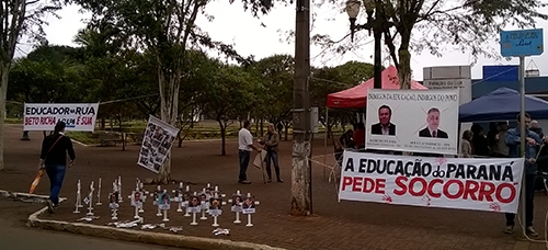 Depois de uma semana, os professores em greve deixaram o acampamento em frente ao Núcleo Regional de Educação. Nesta segunda-feira a mobilização foi em frente ao terminal urbano. Teve barraca, faixas, cartazes, panfletagem e, é claro, o “cemiterinho” dos deputados que votaram a favor da reforme na Paraná Previdência. E a greve continua...